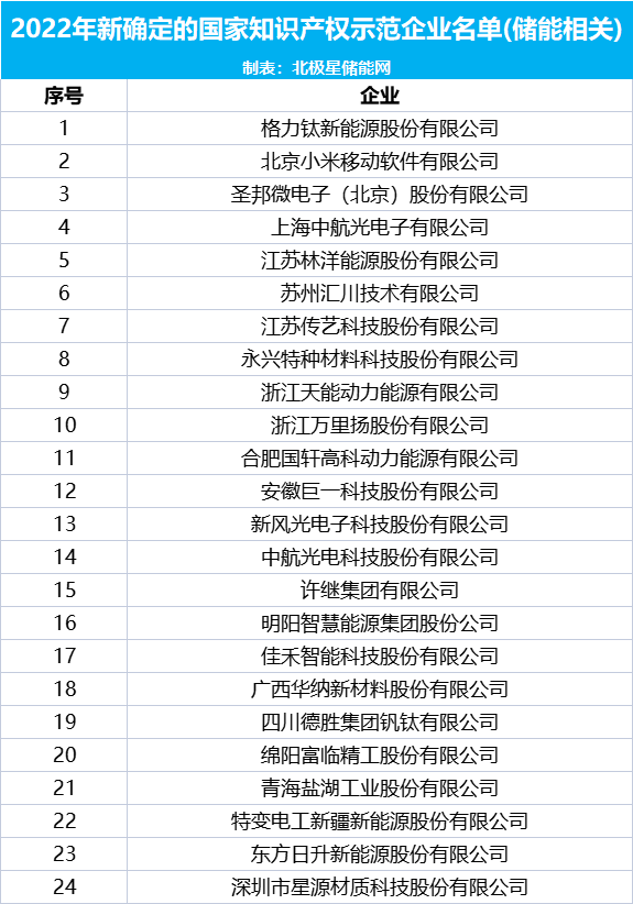 其中包含储能相关企业106家,新一批国家知识产权示范企业中包含格力钛新能源、林洋能源、新风光电子、汇川技术、国轩高科、许继集团、特变电工、东方日升等企业,新一批国家知识产权优势企业包含华能清能院、泓慧能源、国能信控、力神电池、派克新材、固德威、贝特瑞等企业,通过复核的国家知识产权示范企业中包含宁德时代、宁德新能源、比亚迪、南瑞继保、国电南瑞、阳光电源、双登集团、赣锋锂业、中车株洲所、阿特斯阳光集团、多氟多、科华数据等企业,通过复核的国家知识产权优势企业中包含中天储能、优利德、中车时代、沃太能源、中车新能源、天能帅福等企业。