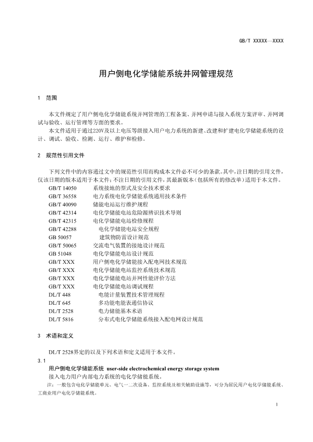 本文件适用于通过220V及以上电压等级接入用户电力系统的新建、改建和扩建电化学储能系统的设计、调试、验收、检测、运行、维护和检修。